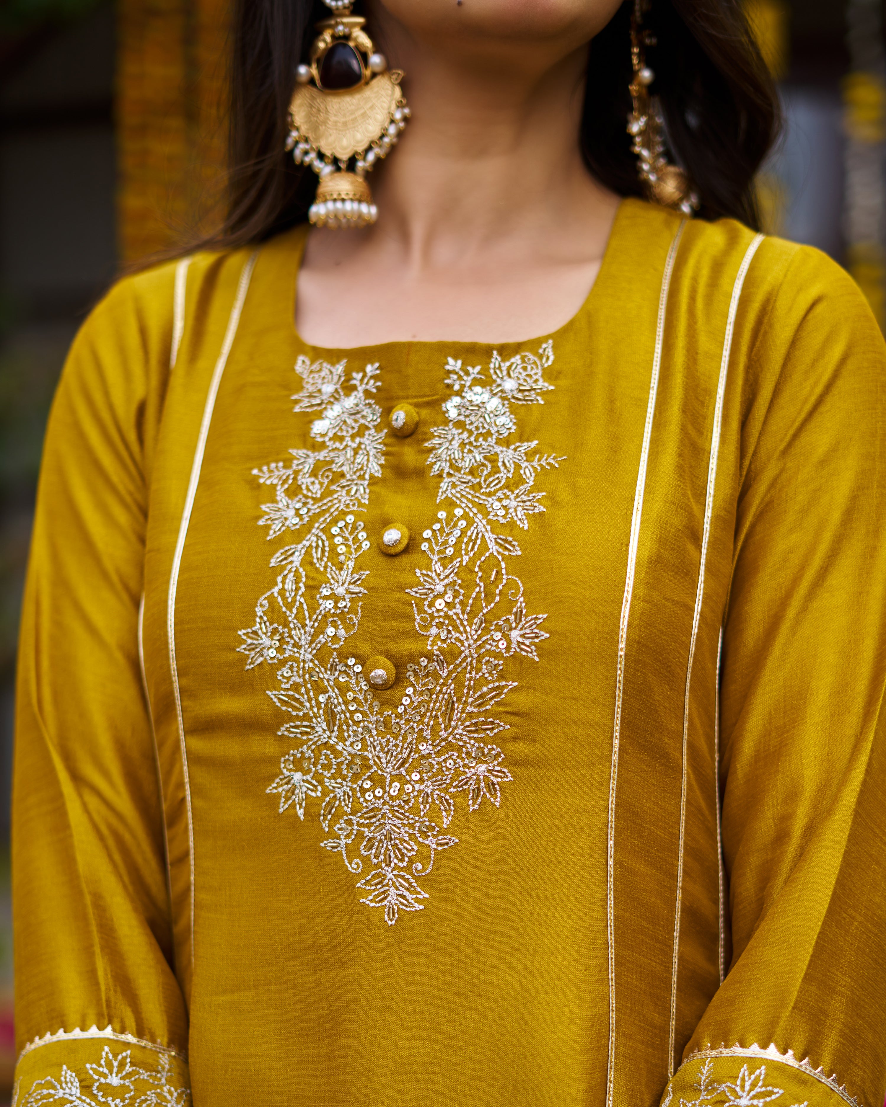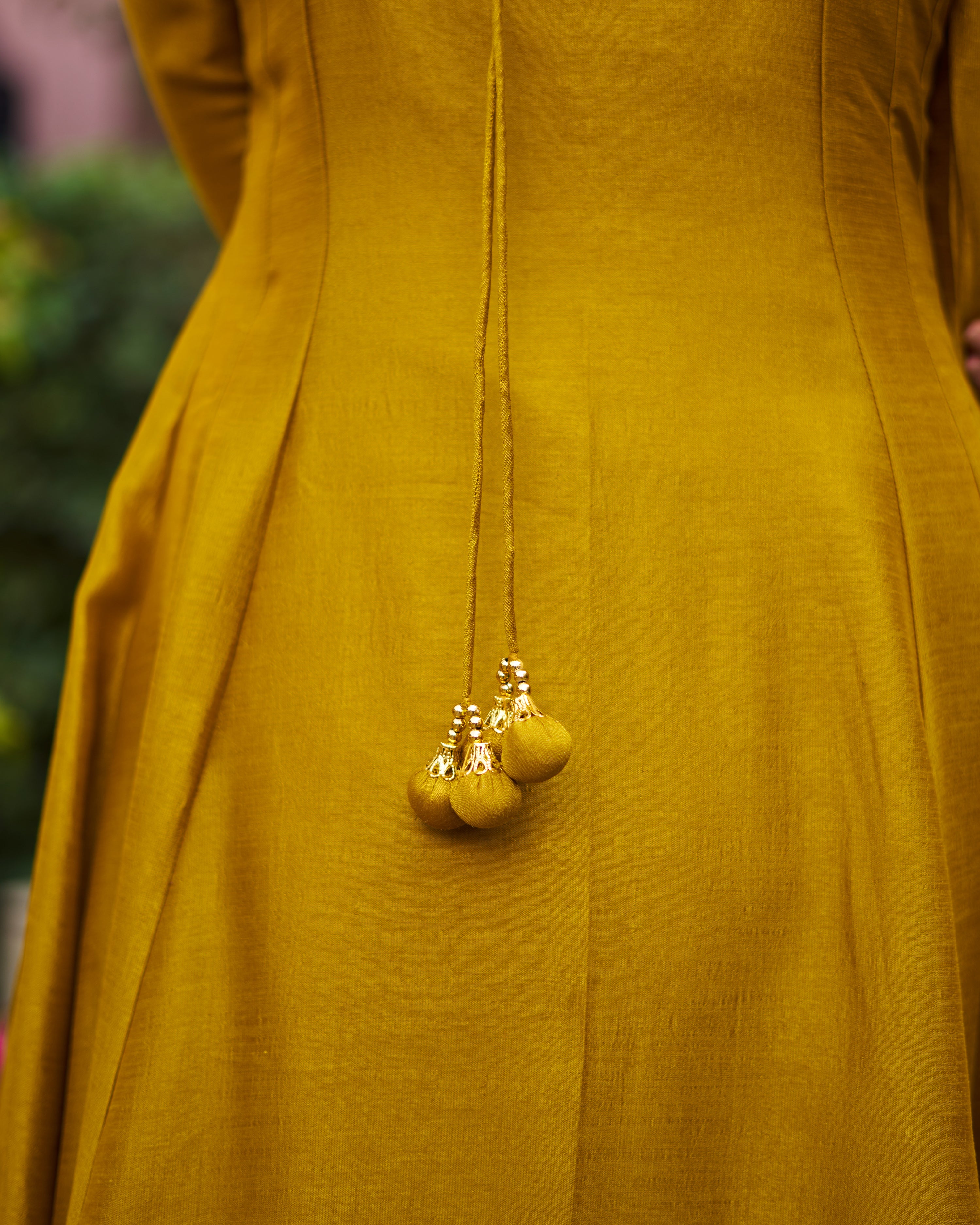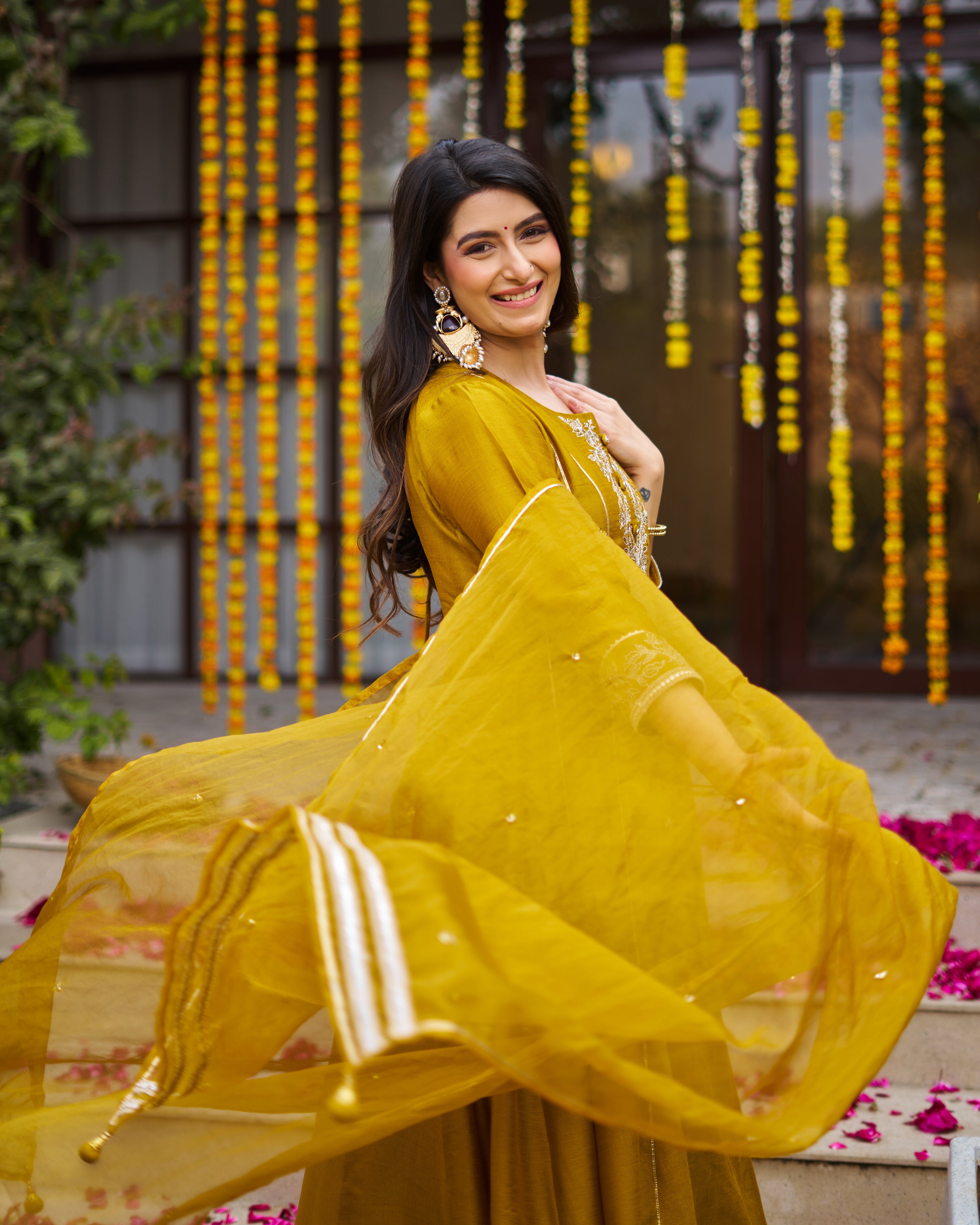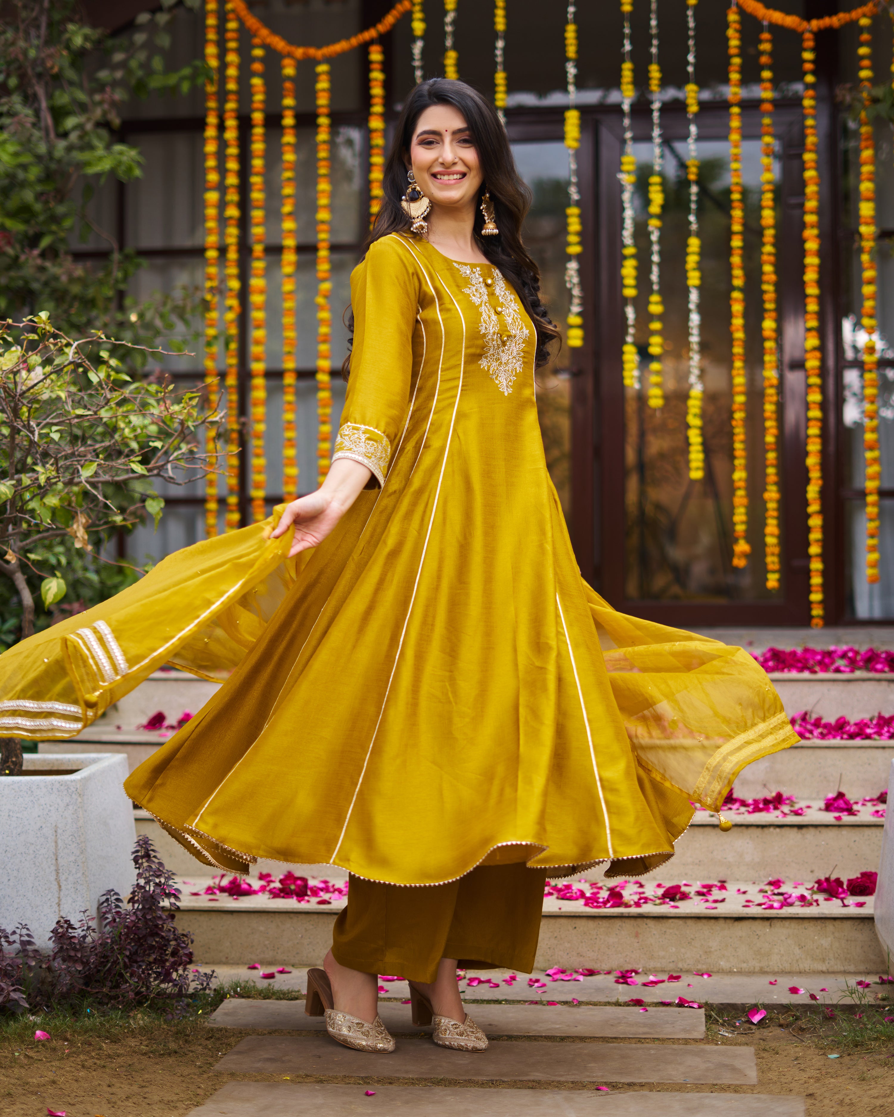 This is a Ginger yellow anarkali kurta with pant and dupatta