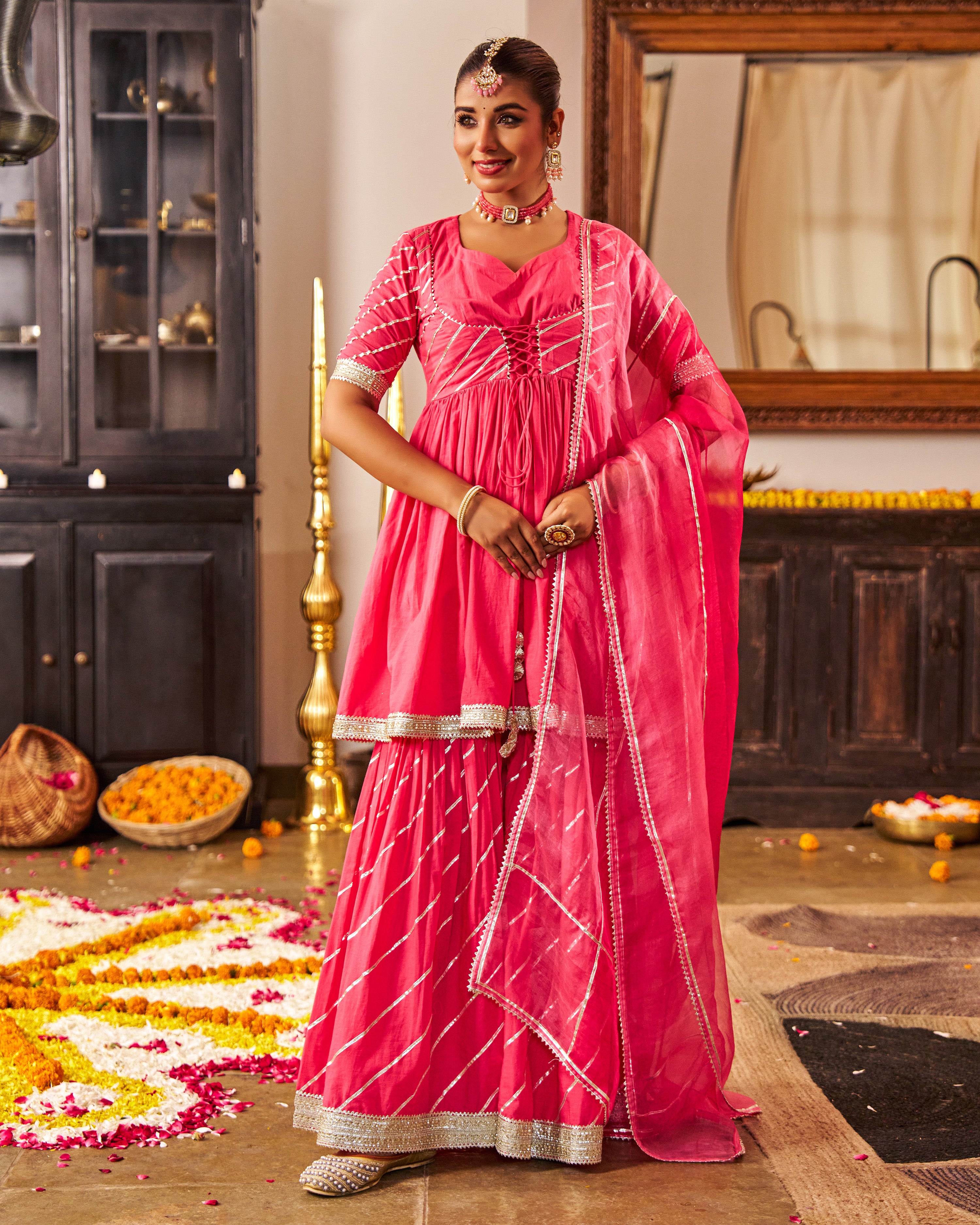 This is a Pink gotta work flared kurta with sharara & dupatta
