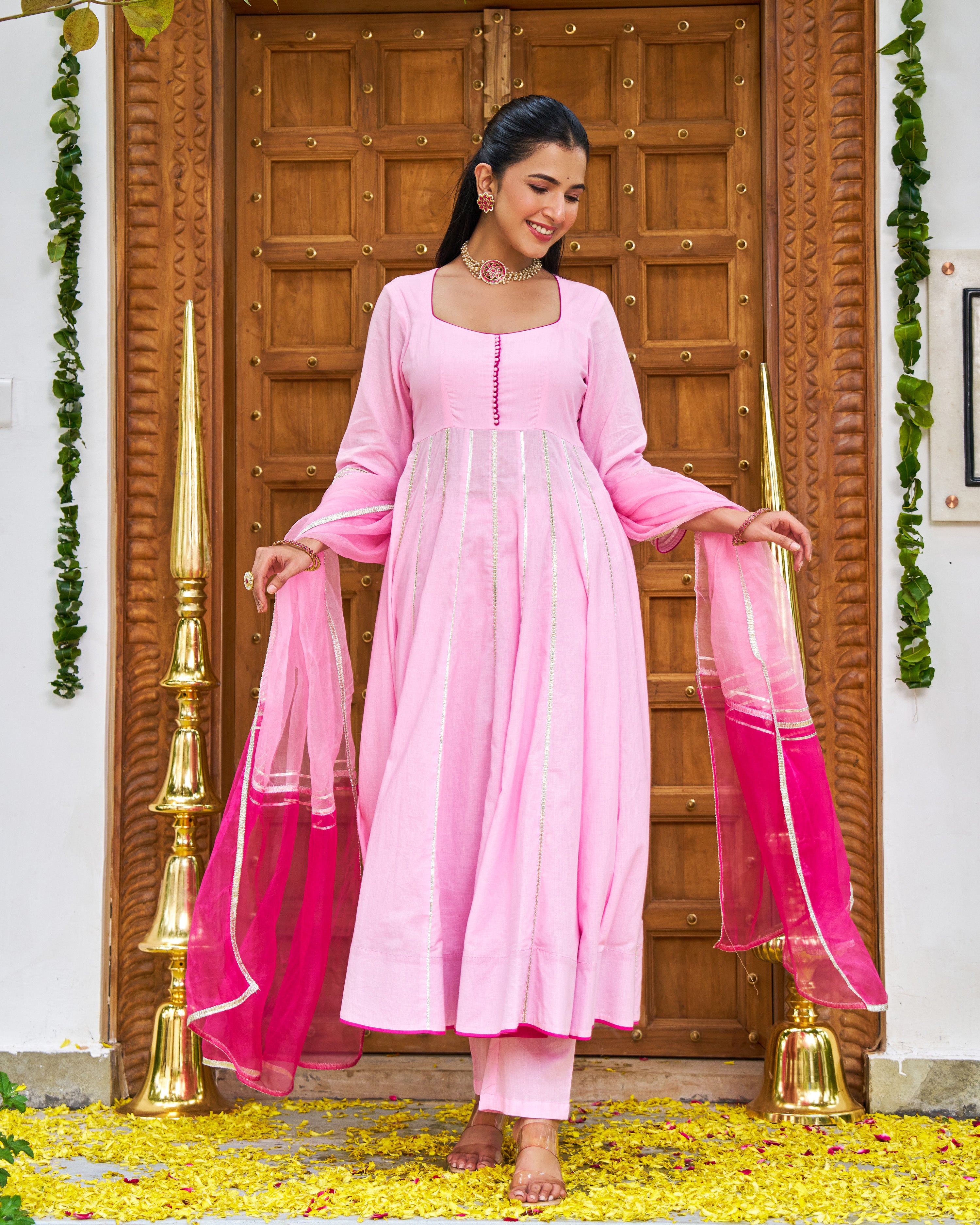 This is a Pink gotta work anarkali with potli button detail paired with pant & dupatta