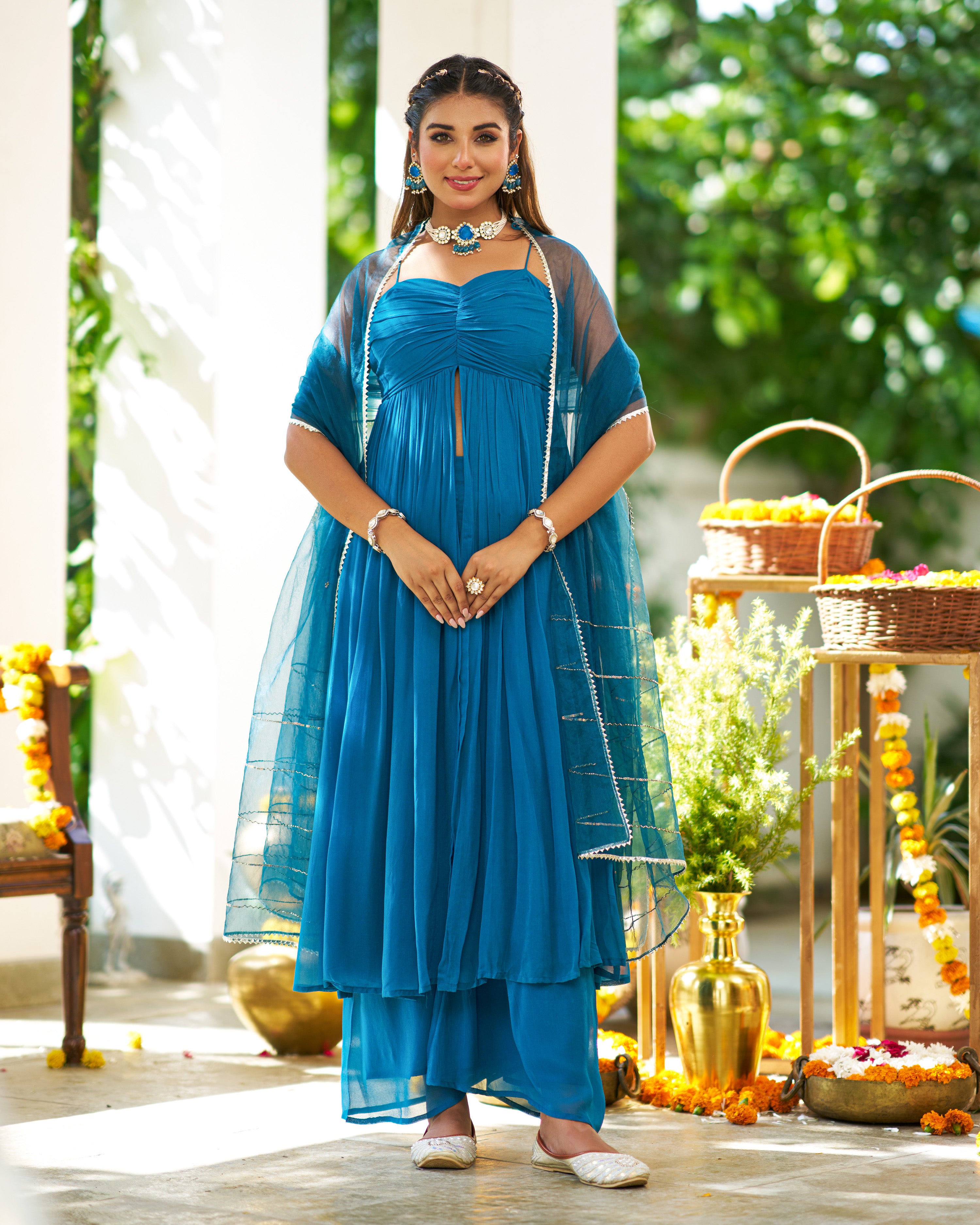 This is a Teal Blue georgette front cut gathers kurta with pant & dupatta